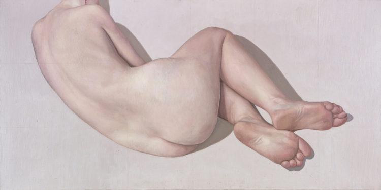 tu parlais durant l’ancien sommeil tu disais des absurdités des absurdités tu ne dors plus de lui pas encore de l’autre déjà ça ne fait plus aucun bruit ça ne raidit plus ta colonne tu te demandes depuis quand c’était la guerre depuis quand j’étais braquée il te tarde le chien de fusil sur les draps du vrai sommeil Alison Watt, "Source III", 1995, huile sur toile. © Alison Watt