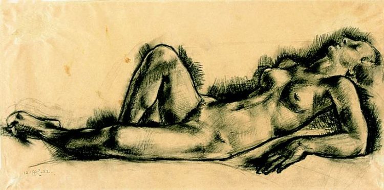 enjamber les heures les dates se mettre en retrait à côté le plus loin possible d’elles se mettre où elles ne sont pas où on ne les entendra pas passer les devancer les oublier les effacer des horloges des calendriers oublier que le temps ce n’est pas du temps c’est de la salive prise dans une autre bouche c’est un rai de lumière qui traverse une chambre de la poussière qui danse des places de concert pliées dans une veste enjamber les heures les dates oublier que le temps ce n’est rien que du temps quand il est gâché impossible impossible Erzsébet Korb, "Nude Reclining", 1922, fusain sur papier. ©Hungarian National Gallery.