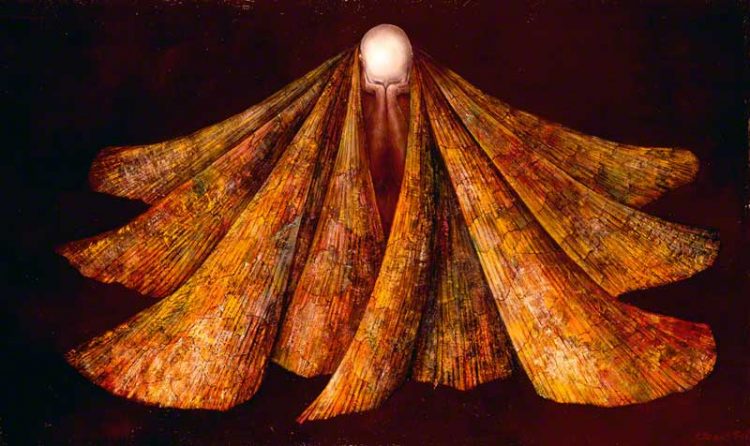 je ne sais plus rien je n’entends plus rien sur ma peau ma peau nue ça tombe comme une pluie acide derrière derrière pas même craintive mon âme qui attend d’être cinglée par les averses drues des salives qui auront troué ma peau ©Leonor Fini, "Enroulement du silence", 1955, huile sur toile.