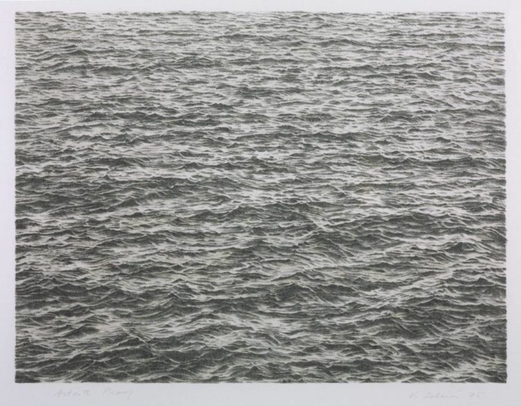 comme dans les flots d’avril de la baie des Trépassés d’abord la morsure brutale puis la chaleur intense de l’eau le regard dirigé vers la grève c’est elle qui ondule le corps fume en surface ça lui dit quelque chose de son devenir il s’immerge entièrement pour ne pas savoir quoi sous l’eau troublée les yeux ne servent à rien l’esprit invente des images l’esprit se demande où commence le ciel si là à hauteur d’épaules ou déjà dans les profondeurs l’esprit décide de tout pas de ciel pas d’océan pas comme ici où les âmes mortes sont au chaud les âmes vives dans le froid Vija Celmins, "Ocean", 1975, lithographie sur papier. © Tate.