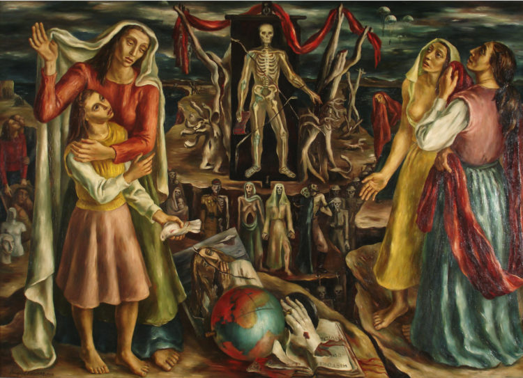 s’il y a dieu comprend-il trouve-t-il explication s’il y a dieu il n’y a plus d’obligation de légendes on peut dire le malheur nourrit ceux-là qui tuent pour faire de l’or on peut dire la pierre philosophale ha ! Simplement de la chair de l’os et du sang on peut dire le courage c’est pour les pauvres ceux-là marqués dès la naissance d’une tare de vétéran on peut dire rien ne nous sauvera de nous-même s’il y a dieu il sait cela il s’en désole mais que peut-il quand les langues lichent l’encre encore humide de l’écriture avant qu’elle atteigne les nervures de volte-face s’il y a dieu devinons sa prière parce qu’il n’est pas resté parce qu’il ne le pouvait pas ou ne le devait pas nous sommes seuls s’il y a dieu il ne s’en désole pas il se désole que nous n’ayons pas appris ce que ça signifie s’il y a dieu il nous a donné du temps pour ça peut-être son propre temps peut-être tout son temps ©Toile de Raquel Forner, El Drama, 1939-1946. Collection Museo Nacional de Bellas Artes de Buenos Aires.