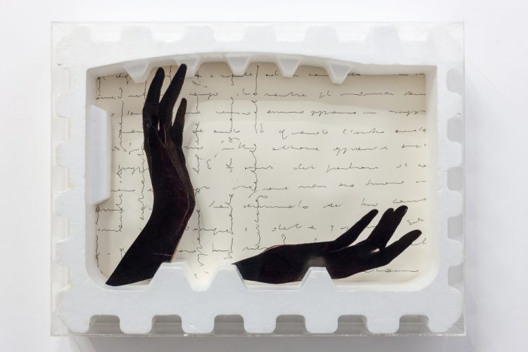 tu ne peux rien écrire à cause de tes mains qui refusent de se faire complices de ta détresse elles restent suspendues dans l'air en défense prête à te gifler elles disent ne plus vouloir t’appartenir elles disent que ça suffit tous ces mots écrits qu’ont-ils fait pour elles elles disent à quoi ça peut bien servir est-ce que ça te sert à toi tous ces mots ont-ils jamais poussé les murs tu ne peux rien écrire tu te souviens de ce poème de jeunesse L'ivresse du renoncement ta main gauche écrit : mauvais mauvais poème tu ne te souviens plus de ta jeunesse ta main droite serre le poing comme à chaque fois que tu mens c’est la main qui souffre le plus celle qui en a le plus marre prête à partir qui sans panique s’imagine posée sur le satin tous ces mots écrits qu’ont-ils fait pour toi t’ont-ils sauvé avais-tu besoin de l’être naître n’était-ce pas déjà un sauvetage ta main gauche écrit : une séparation d’avec l’éternité ton poing droit se serre il n'aime pas la grandiloquence mais il sait que tu ne mens pas tous ces mots écrits une simple tentative d’être de travestir la transparence tous ces mots rien d'autre que le prolongement de tes gribouillis d’enfant tu te revois déchirer en criant la feuille avec la pointe de ton crayon parce que nulle part le soleil ne semblait à sa place tu ne peux rien écrire à cause de ta détresse d’avoir dessiné tant de soleils ratés et de ta crainte de les avoir tous épuisés la lumière te manque elle semble s’être éteinte et qu’est-ce que cette nuit si ce n’est une page entièrement recouverte de noir Illustration du texte ©Tomaso Binga, Mani per una parabola 1973, polystyrène, collage et plexiglas, ©Tomaso Binga et Galleria Tiziana Di Caro.